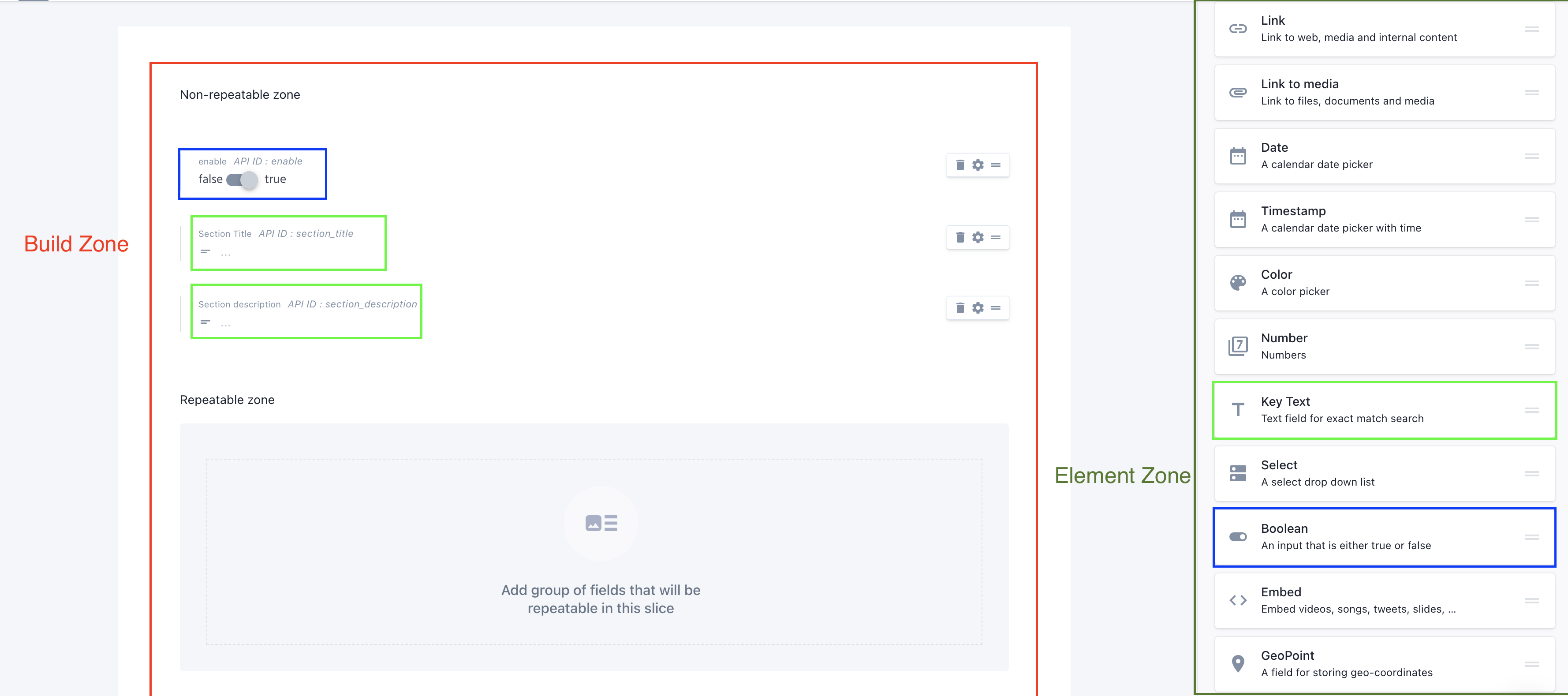 To add the fields into the component(slices), simply drag a element from the element zone and drop it to the required build zone.